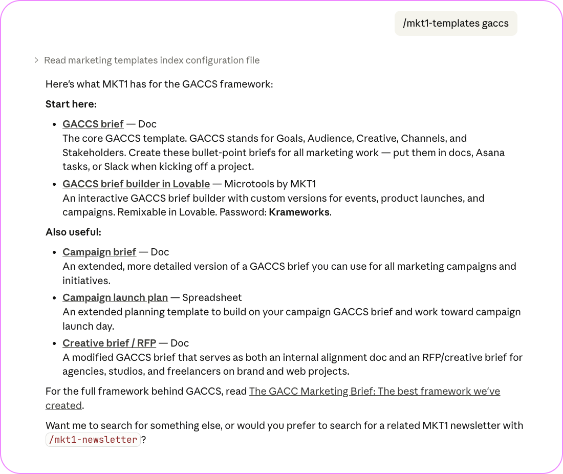 I’ve started building Claude skills that run MKT1 frameworks for you. So far, they cover channel strategy, homepage positioning, Marketing Advantages, GACCS Briefs, and finding newsletters & templates for specific topics (and more are coming soon, I can’t stop Clauding!).