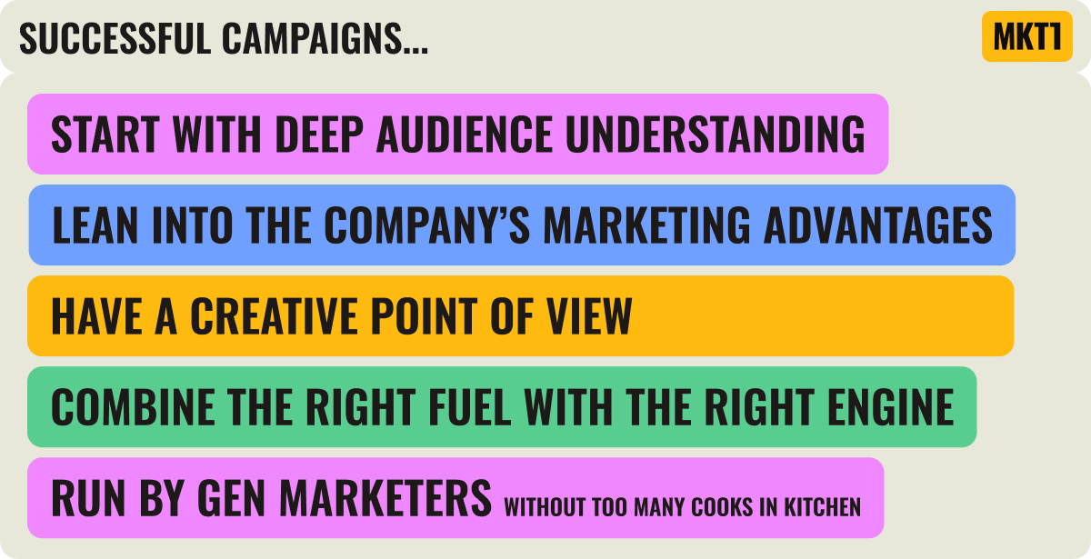 These campaigns have the following in common: a clear creative idea, rooted in audience understanding, leveraging real Marketing Advantages, pairing fuel and engine that actually go together, and run by Gen Marketers who are able to move fast without sacrificing quality.
