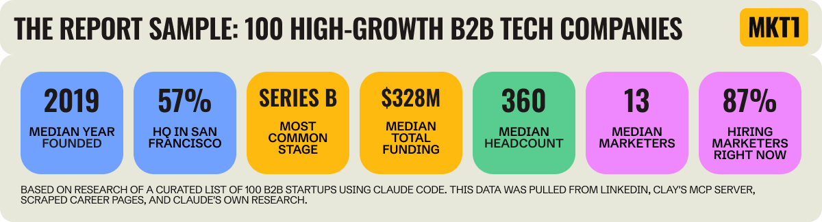 Query the full dataset behind this report: 100 high-growth B2B startups, 90+ data points each, covering GTM motion, team composition, social, ads, homepages, CMS, conversion, and AEO readiness.