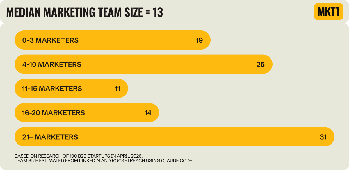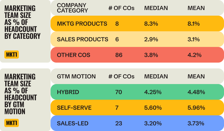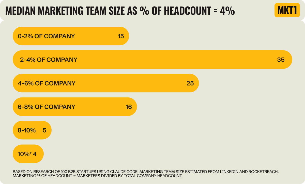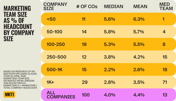 Marketing team sizes are a bit all over the place. I love a tidy benchmark, and 2-4% of total headcount is the typical range. But GTM motion, category, and founder preferences shape the actual number a lot.