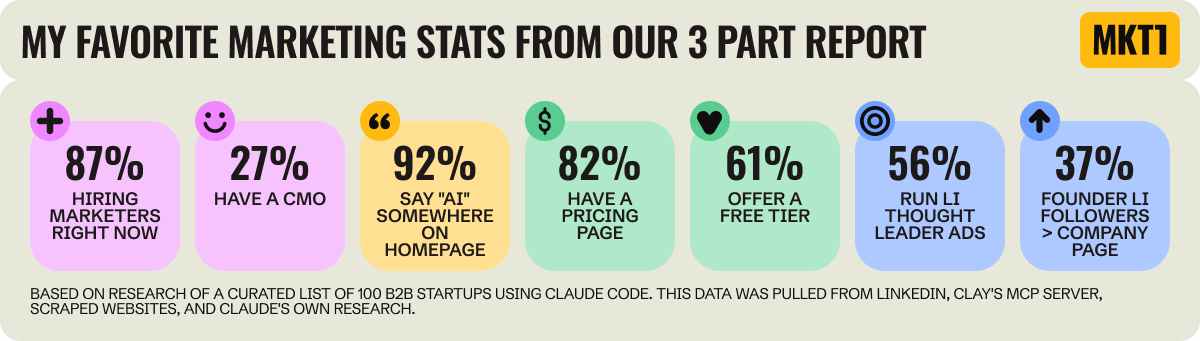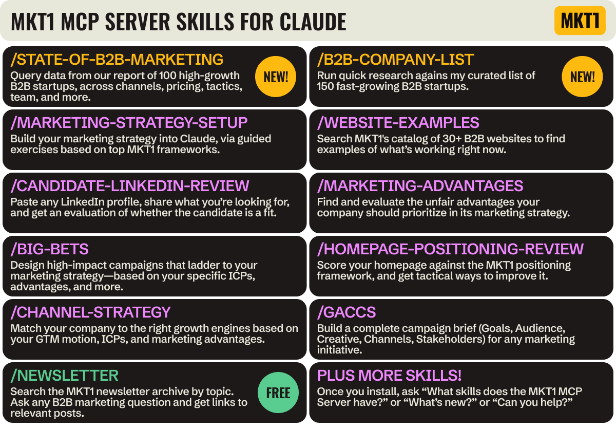 That’s what I did with this report. Claude both co-created the fuel and is the engine for distribution. The research lives as two skills in our MKT1 MCP Server. Now you can use them to benchmark yourself against 150 companies in B2B, or answer the kinds of questions I get asked as an advisor all the time.