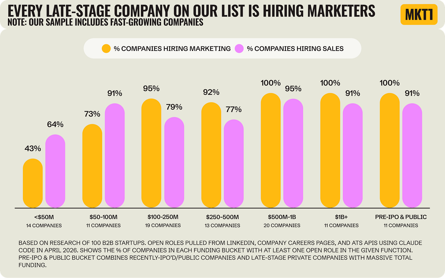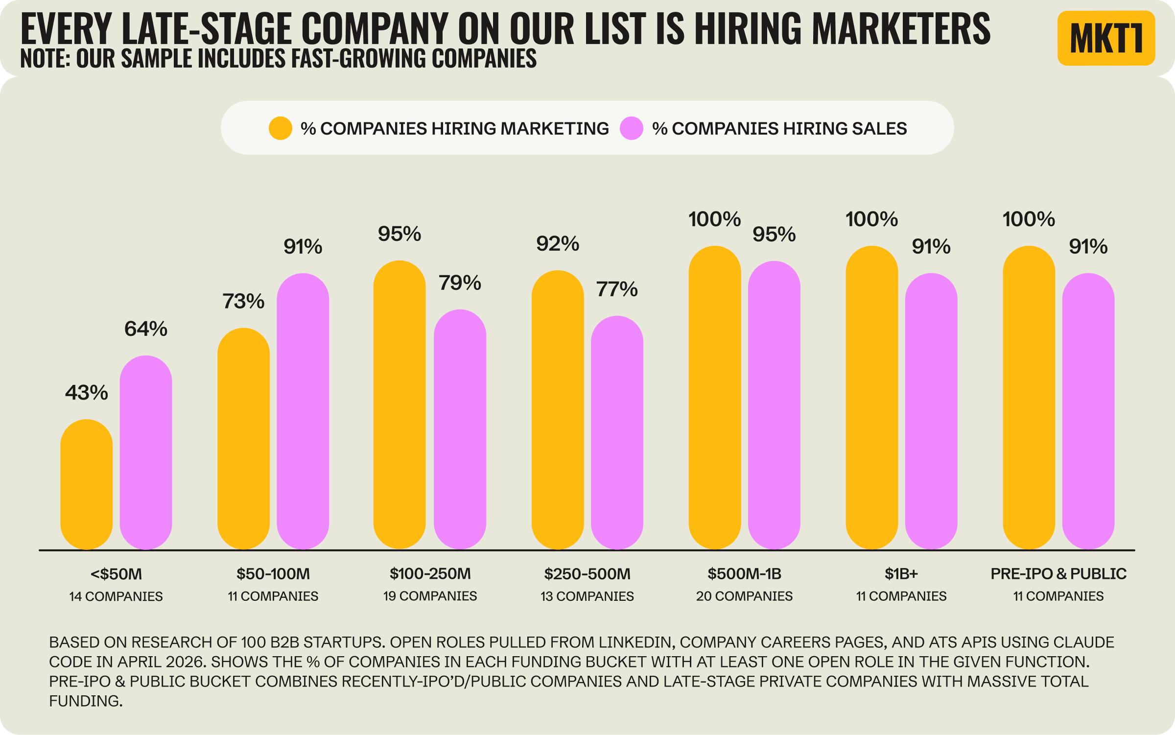 ➜ 100% of companies with more than $500M in funding are hiring marketers right now