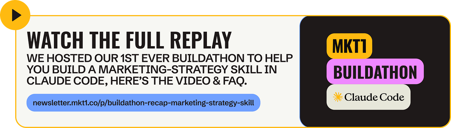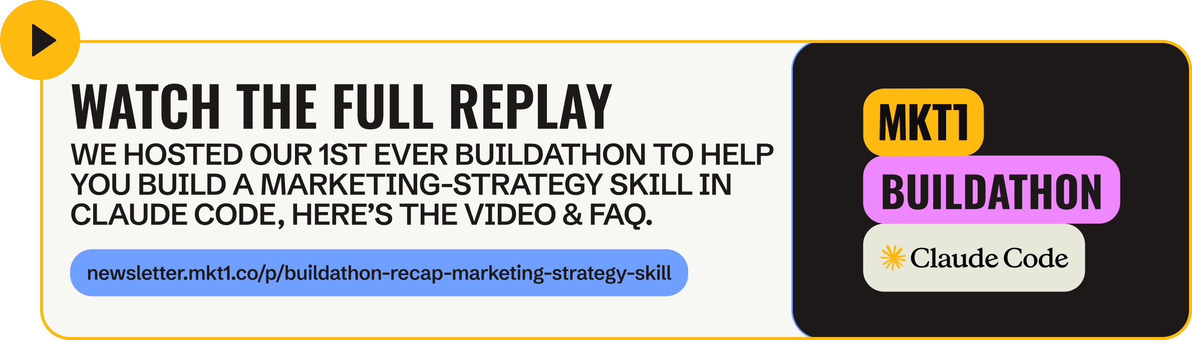 👩💻 MKT1 Buildathons: Missed our first Buildathon? Watch the replay to see how to build a /marketing-strategy-skill in Claude Code. Want in on the next one? Get on the waitlist.