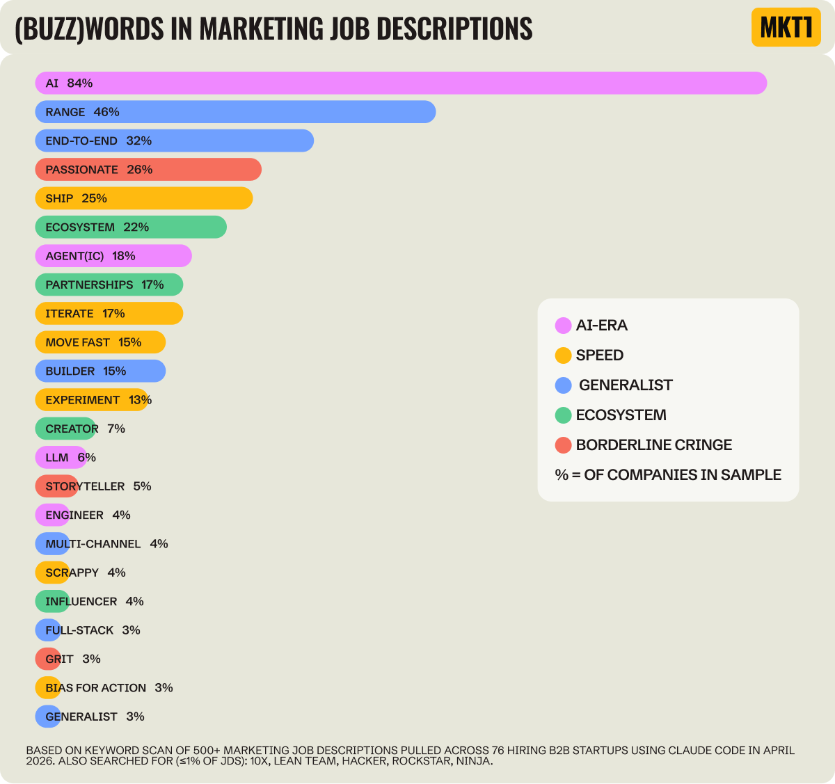 There are marketing jobs out there. And yes, you do need AI skills to get them.Companies are asking for people with broad skillsets and loading the JDs with AI tools and AI buzzwords. But the job titles haven't caught up yet; companies are still mostly hiring for specialist roles. The next time I run this report, I expect to see more generalist, campaign lead, and marketing chief-of-staff titles, and fewer narrow sub-function JDs.