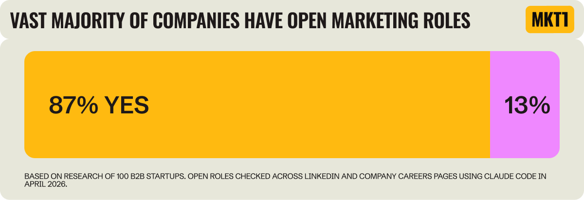 ➜ Yes, companies are hiring marketers. 87 of the 100 in our sample have open roles, many with more than 1