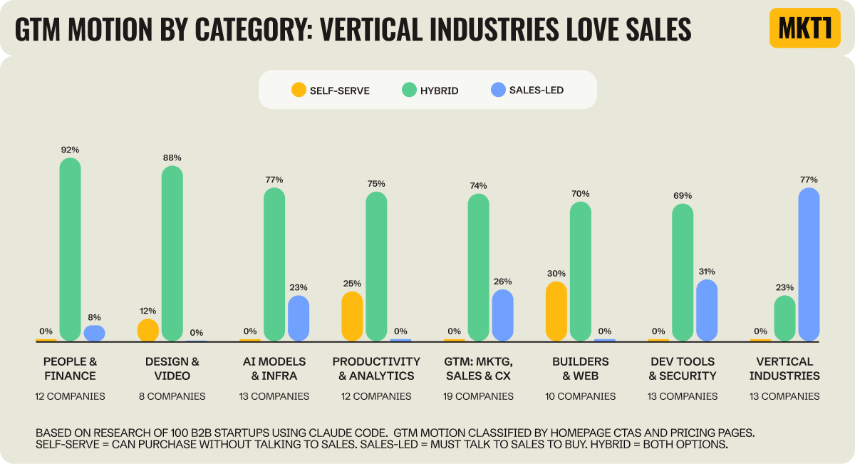 Certain categories default to certain GTM motions. Vertical-focused startups like Harvey (legal-tech) and Abridge (health-tech) go sales-led because the TAM is narrower and the buyers expect a relationship.