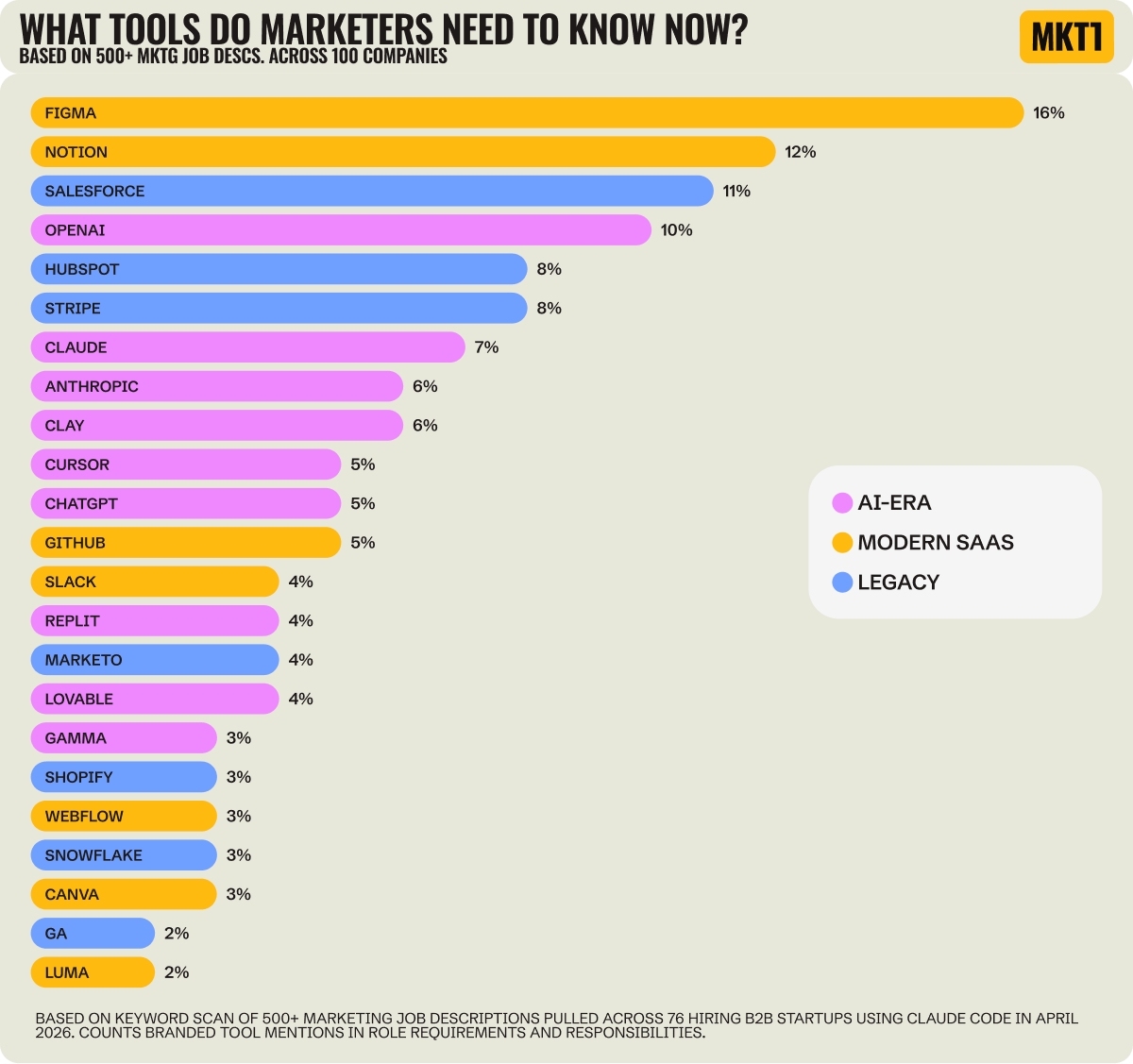 OpenAI (10%), Claude (7%), Anthropic (6%), and ChatGPT (5%) all show up at meaningful rates. Each one shows up roughly as often as HubSpot (8%) or Salesforce (11%). Lump them together and “AI labs” is the most-mentioned tool category in marketing JDs.