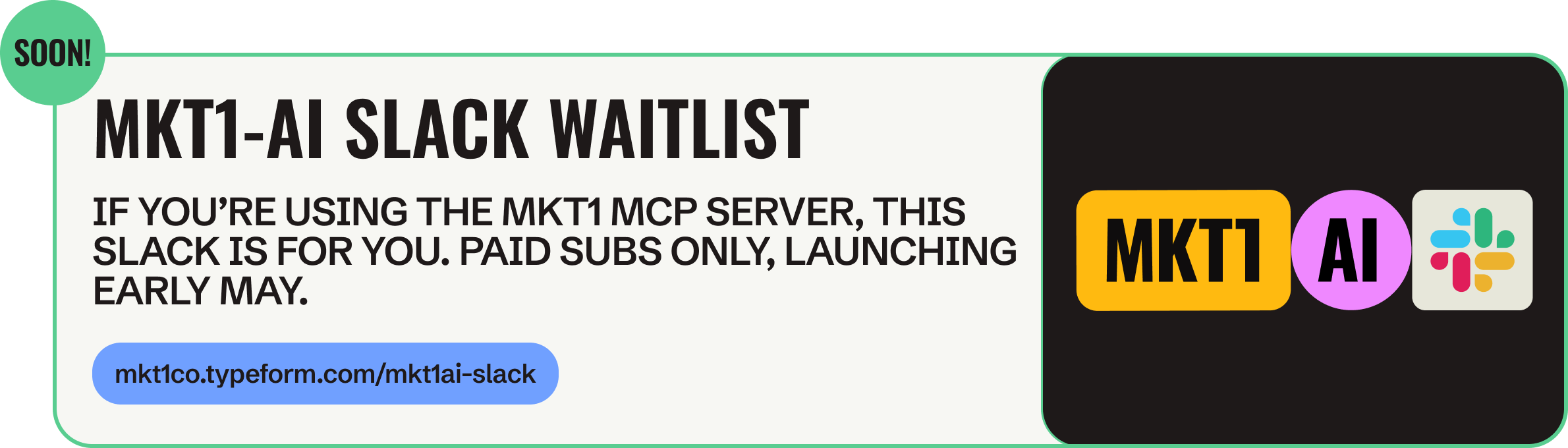 Good news, we’re launching a Slack just for talking about using Claude Code or Cowork and/or our MCP Server. It’s invite-only for paid subscribers using the MKT1 MCP Server users. Get on the list ➜