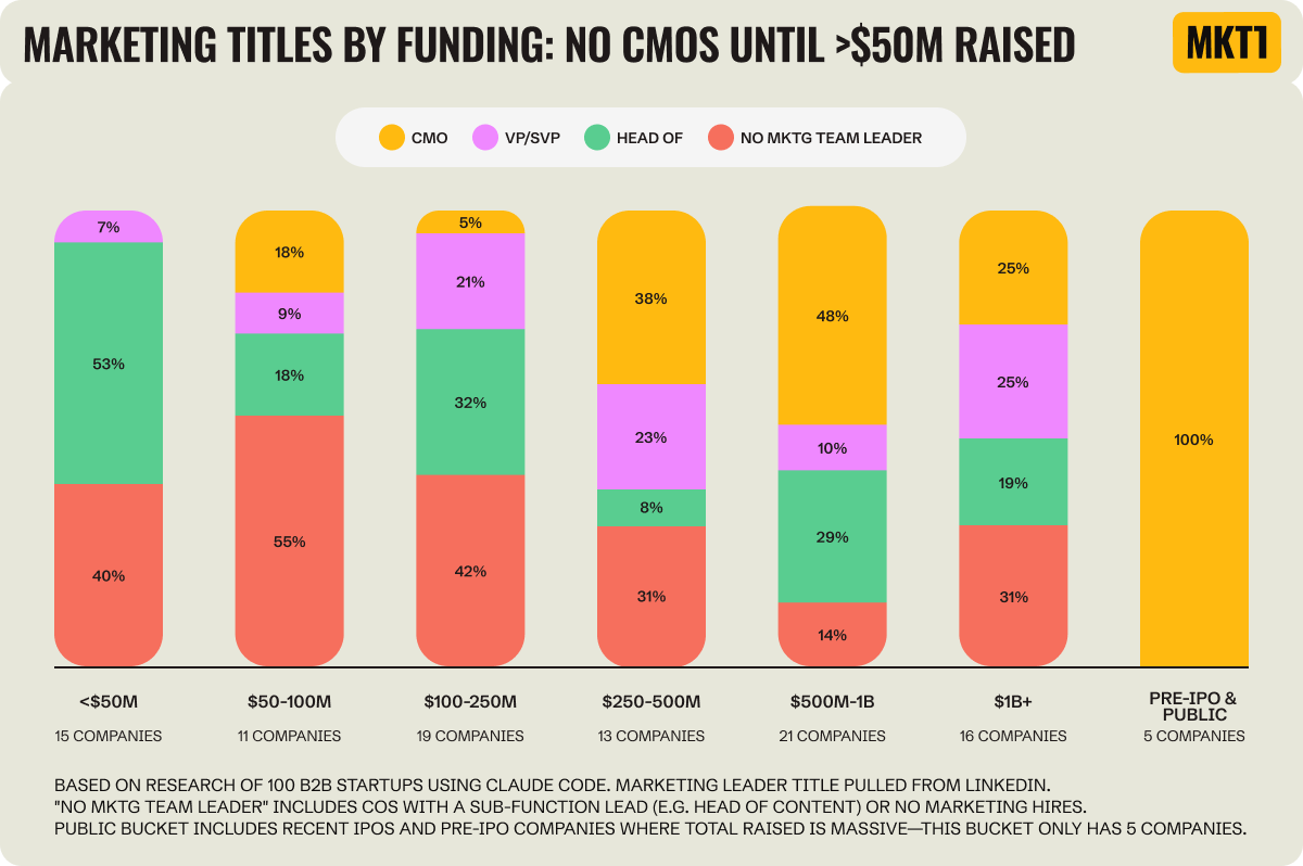 Early-stage teams often have no one leading all of marketing. 40% of companies with less than $50M raised don’t have a unified marketing leader; 53% have someone with a “Head of” title.