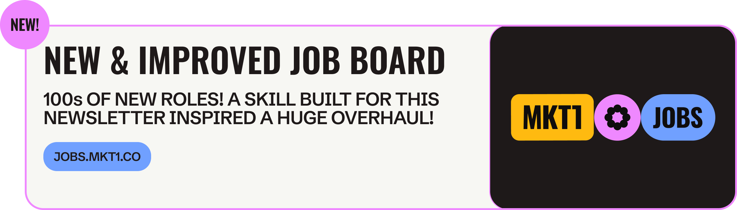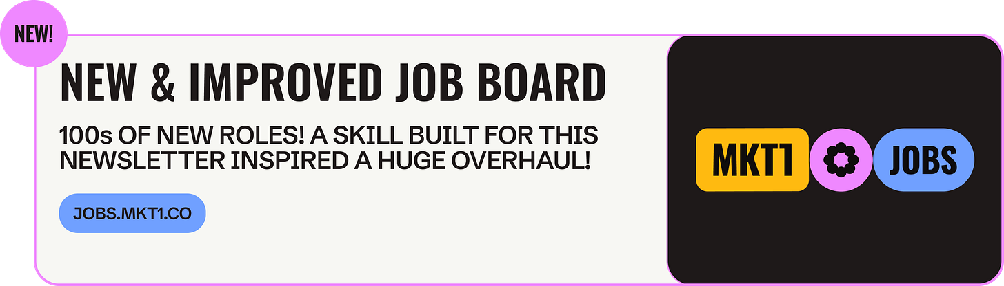🧑🚀 MKT1 job board - new & improved: Jobs from the MKT1 community (it’s free to post as a paid subscriber). And our candidate form if you’re looking for a new role (option to remain anonymous included!).
