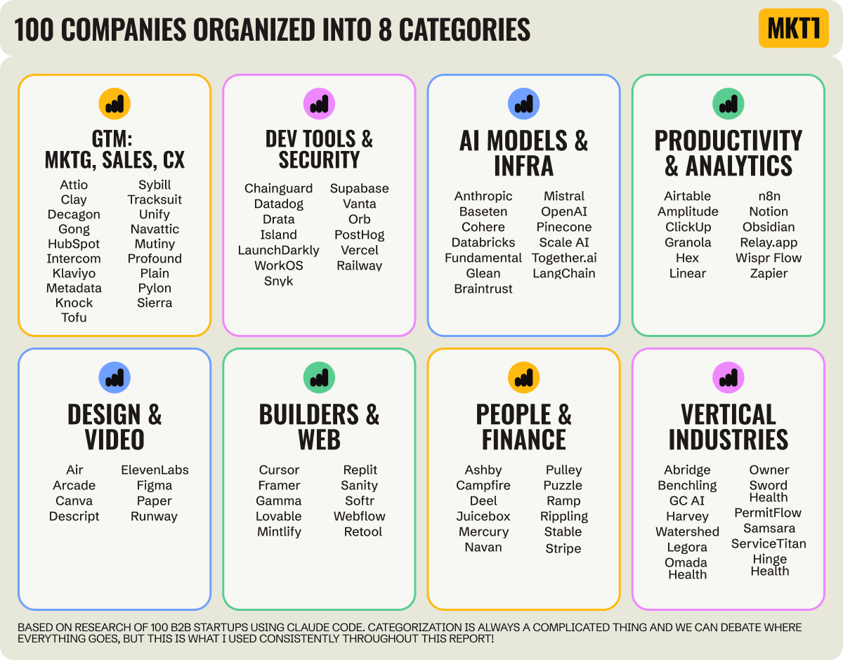 I chose 100 B2B startups, mostly venture-backed, from seed to IPO, concentrated in growth-stage. I targeted companies with recent funding rounds, high-growth trajectories, that are referenced as a startup to watch, or are default B2B tools we all know. Claude helped me pull this list together, of course.