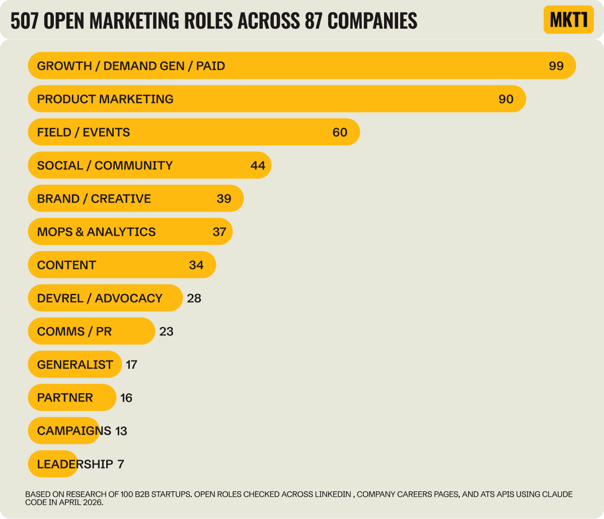 Growth / Demand Gen / Paid leads with 99 open roles. Product Marketing is right behind at 90.