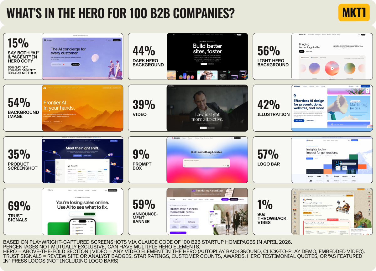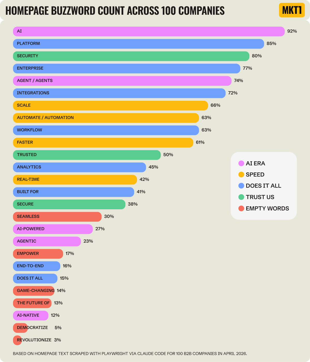 ➜ We’re all AI platforms now: 92% of B2B homepages say “AI” & 66% say “platform”