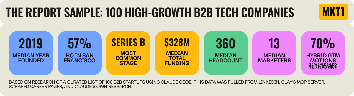 Query the full dataset behind this report: 100 high-growth B2B startups, 90+ data points each, covering GTM motion, team composition, social, ads, homepages, CMS, conversion, and AEO readiness.
