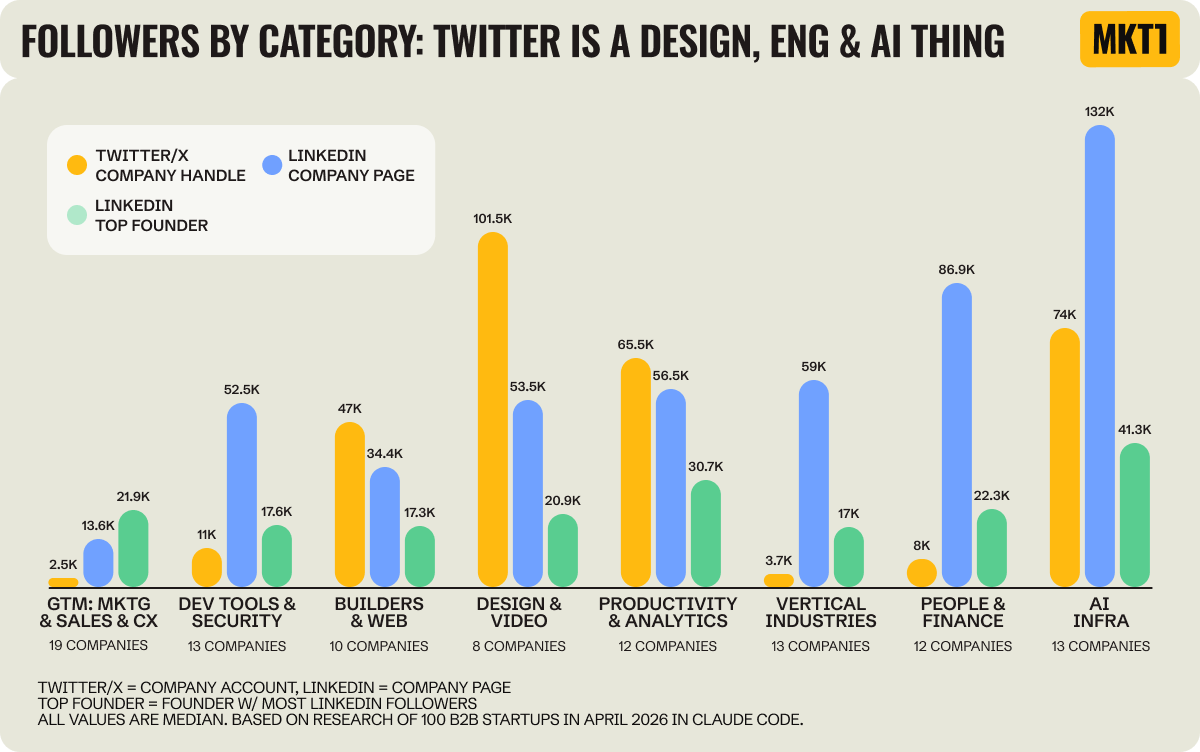 To break this down, Twitter beats LinkedIn (in median followers) in 3 categories: Design & Video (101K Twitter vs 53K LinkedIn), Builders & Web (47K vs 34K), and Productivity & Analytics (65K vs 56K).