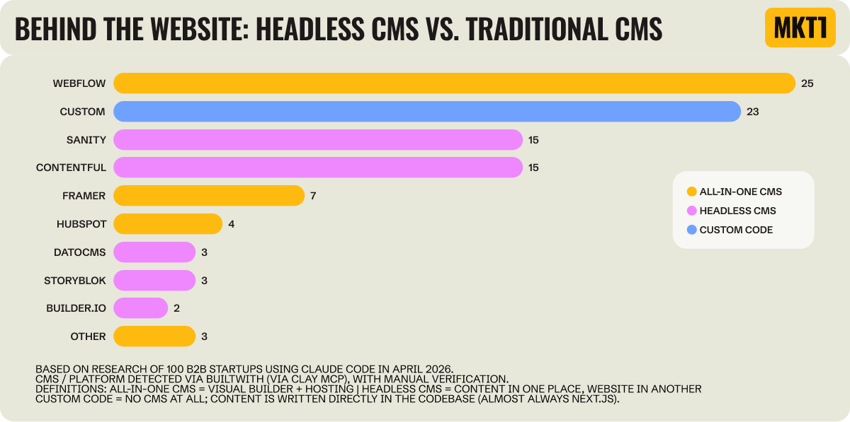 0 companies in our study have fully vibe-coded websites. Most use an all-in-one site builder or headless CMS.
