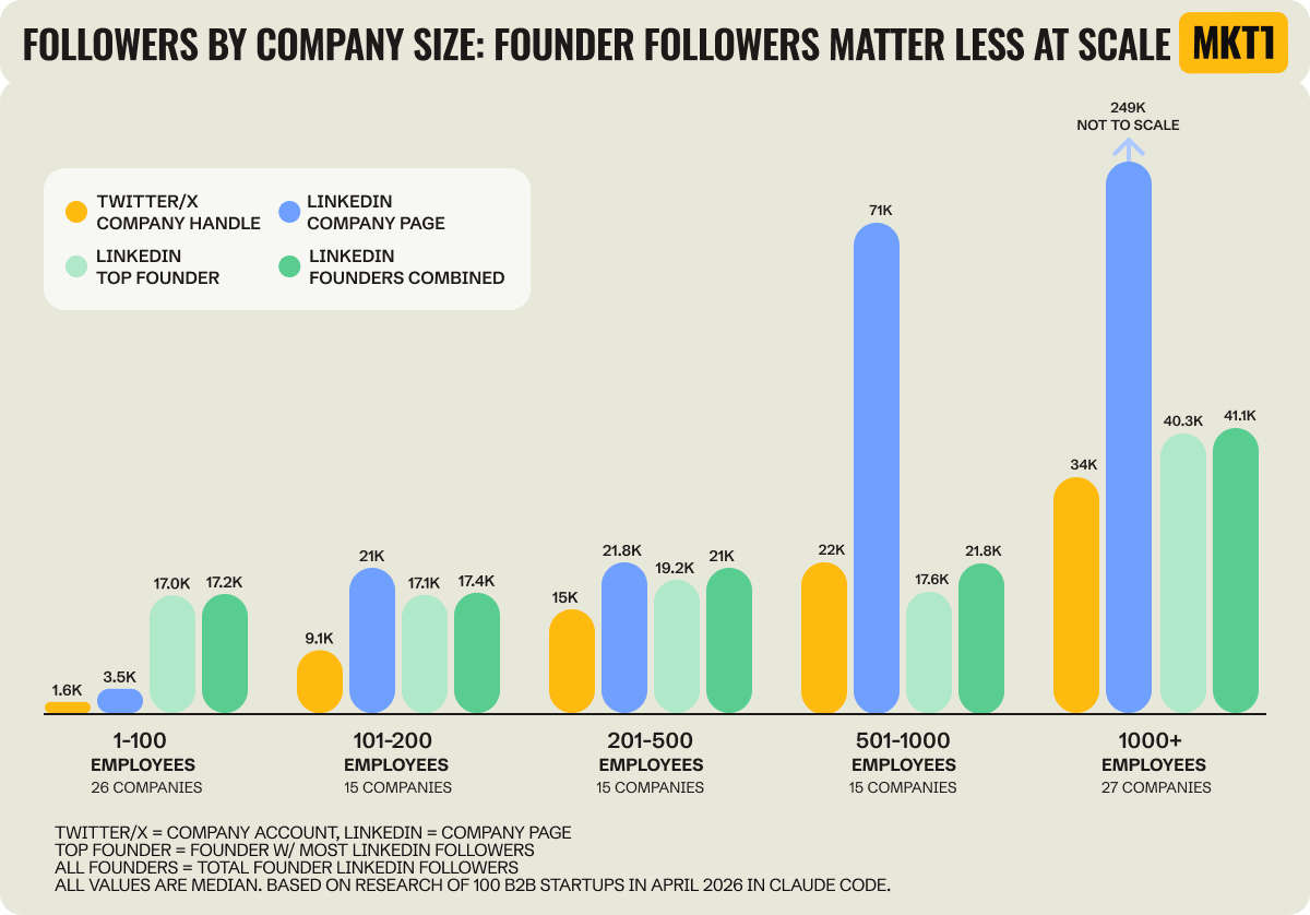 73% of founders at companies under 50 employees have more LinkedIn followers than their company. At 1K+ employees, only 7% do.