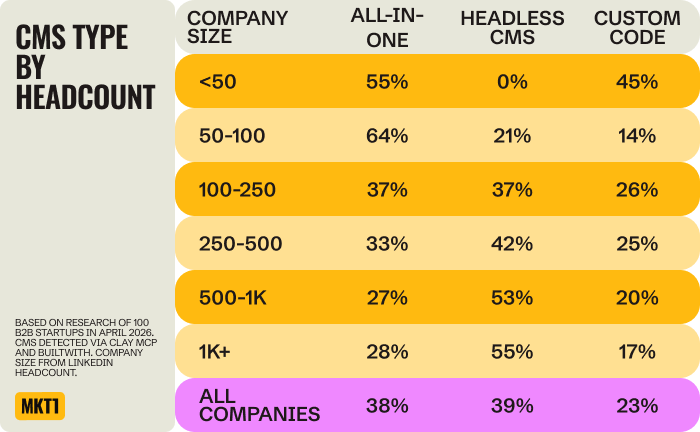 At over 250 employees, there are more headless CMS sites than all-in-one CMS sites. At 50-100 employees, only 21% are on a headless CMS; by 1K+, it’s 55%.