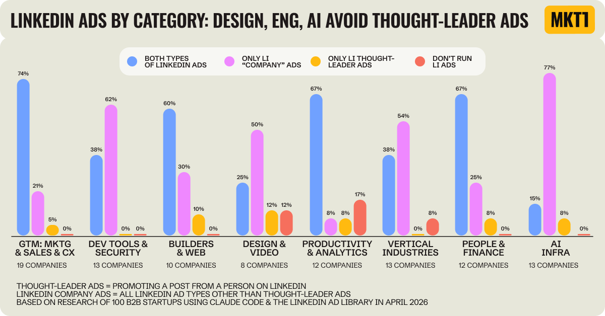 Surprising pattern: Companies in the AI Models & Infra category have the biggest founder LinkedIn followings (41K median, ~2x other categories) but the lowest LI thought-leader ad adoption (23%). The personal brands are massive, but they're not turning them into paid amplification—maybe they should?