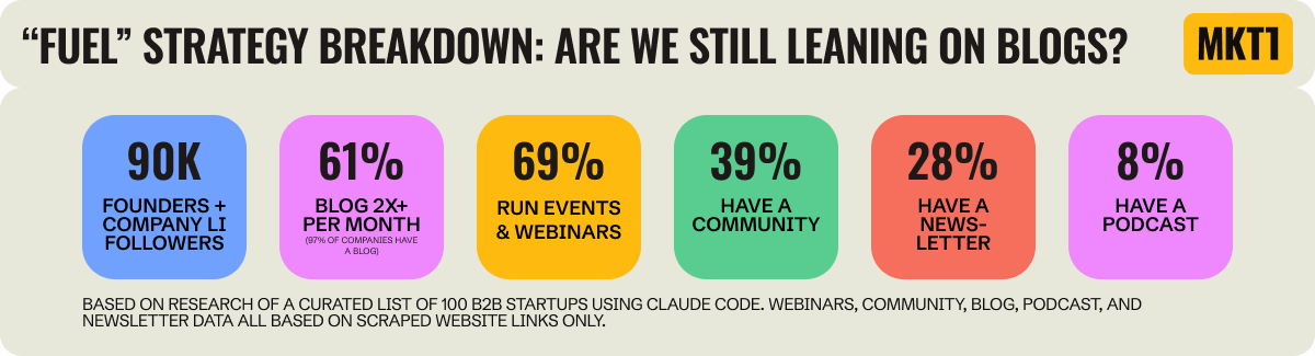 Last up in this report, the state of marketing fuel. By "fuel" I mean content broadly: blogs, events, communities, newsletters, podcasts. I was particularly curious about two observations: that events are on the rise, and that while everyone's talking about AEO, many are still behind on actually readying their websites to be read by LLMs.
