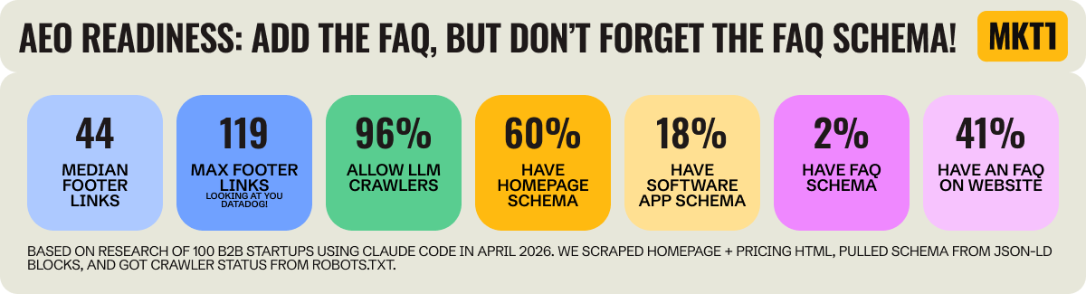 My Claude Code research and web scrape can’t see everything, but the patterns are clear: Communities and newsletters are popular for companies with technical and design buyers (61% have communities vs 23% of non-technical companies), events are popular for sales-led GTM motions (78% run them), and AEO is universally underinvested in (less than 2% of companies have all the basics in place).
