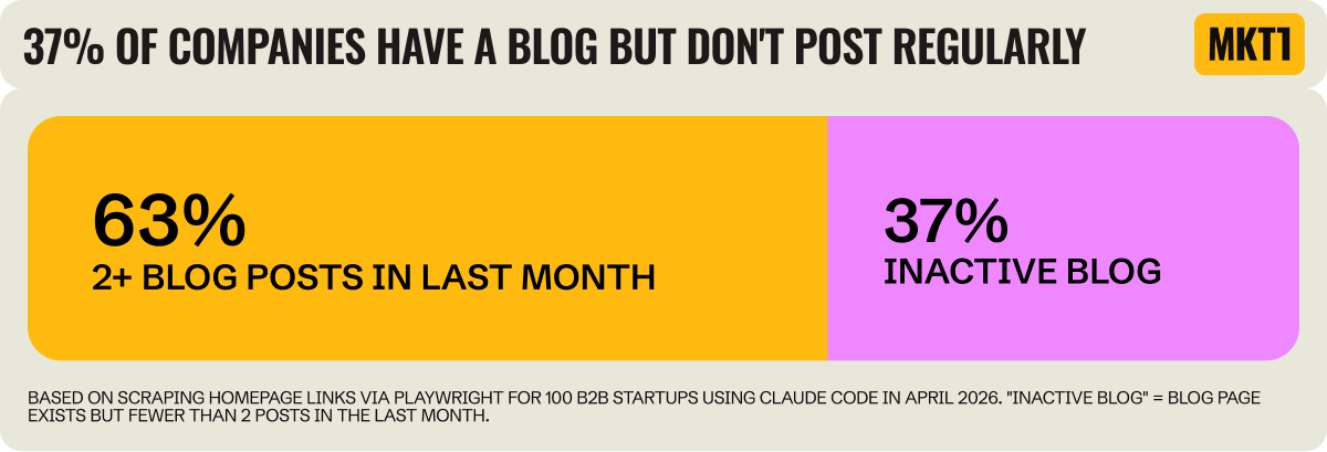 Dev Tools & Security is the surprise laggard with only 46% having an “active” blog, but they're likely publishing to their docs instead. I.e. Stripe, Datadog, and Vercel all have massive documentation sites that double as content.