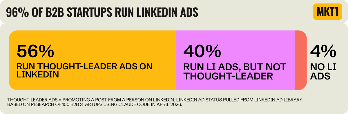 Currently, LinkedIn dominates. But with 96% of companies running LinkedIn ads, just being on the platform isn't differentiation anymore. The teams that stand out are leaning into growing founder followers and thought-leader ads to put individual voices forward (but still only 56% of B2B startups are using these).