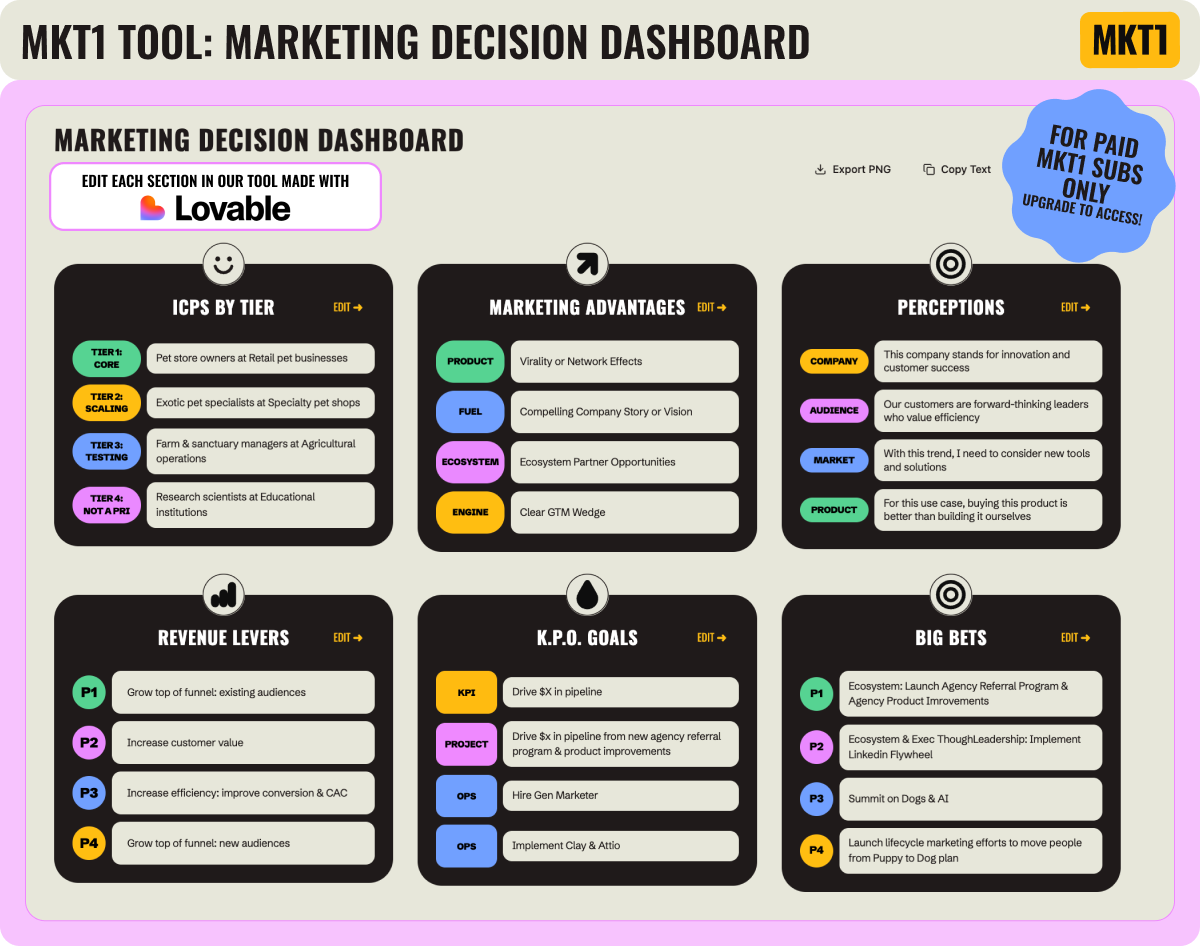 We vibe-coded an interactive Marketing Decision Dashboard builder in Lovable aimed at helping you define big bets during annual planning. We also have a Slides template where you can get really granular on each part of your dashboard.