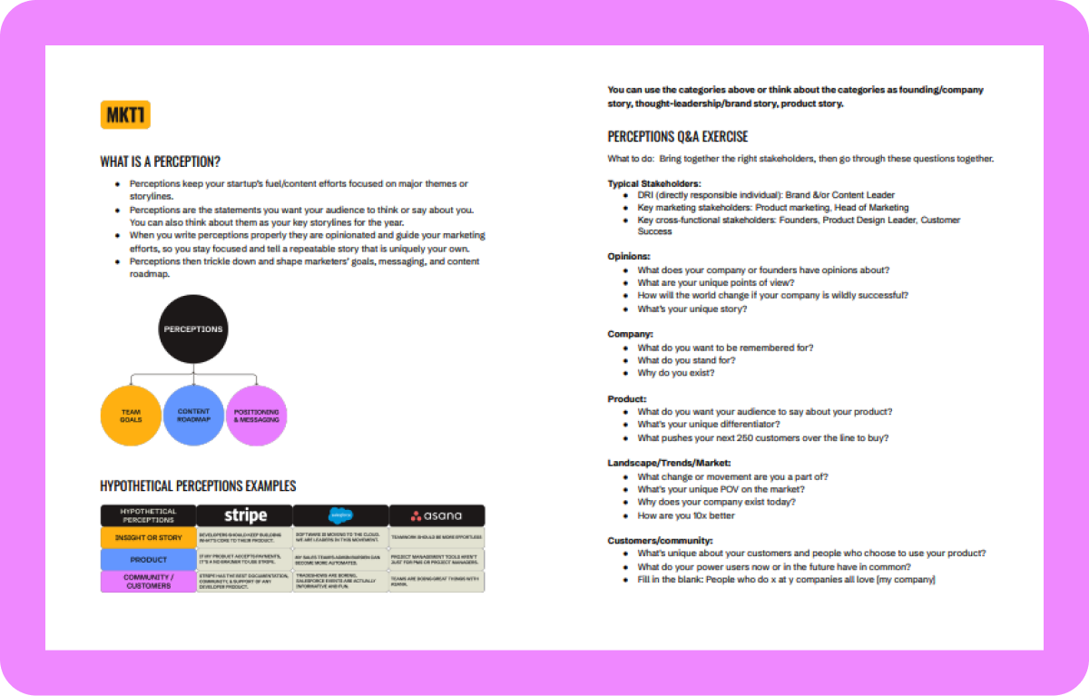 Perceptions are the key narratives you want to drive in your market. They help you tell a consistent, repeatable story across all “fuel” efforts. Use this docs template for writing Perceptions to align your team around telling the same differentiated story.